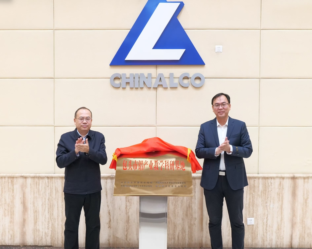 市委常委、组织部部长董欣悦与包头铝业党委书记、执行董事张瑞忠为包头市铝产业教学科研基地揭牌。