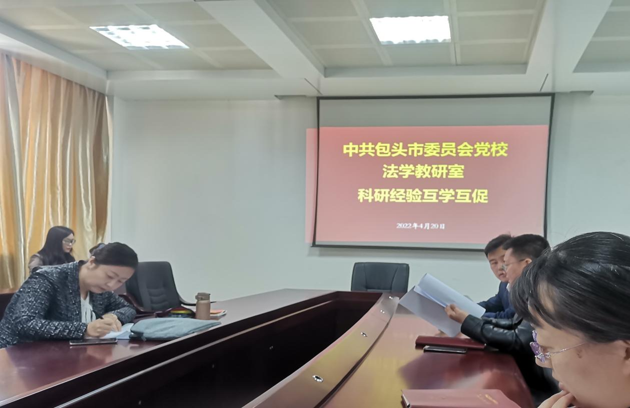 2022-05-07 中共包头市委党校2022年4月20日上午,为进一步加强教研室全体教师科研能力与水平,法学教研室开展科研经验互学互促交流会。会议由负责2022年度在法学教研室主持工作的李冰晶副教授主持,全体法学教研室老师参会。