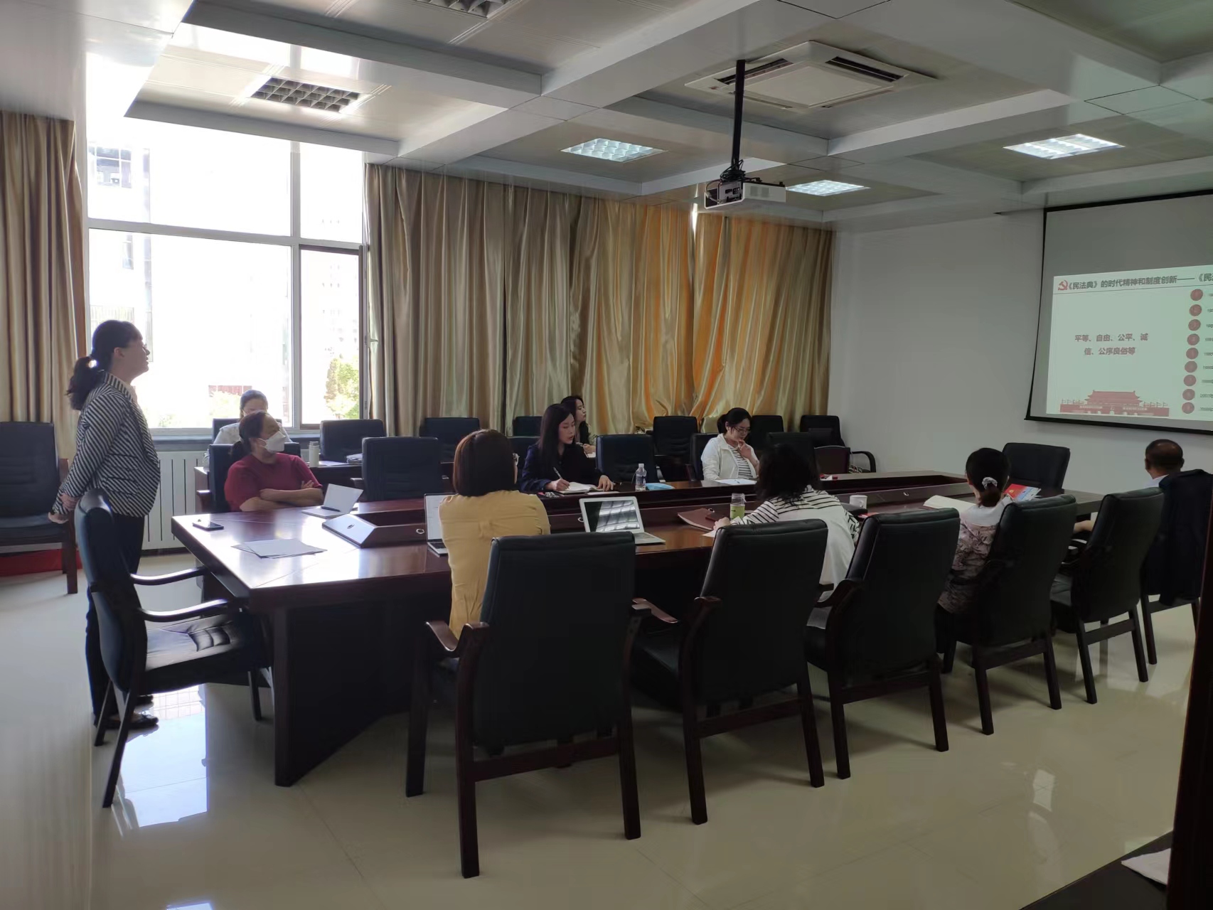 2022年5月20日,法学教研室开展集体备课活动。本次集体备课由孟婕老师主讲,其授课题目为《民法典的时代精神和制度创新》。该课程选题得当、紧随时政需求,拟在2022年度包头市青干班中开展授课。本次集体备课为《民法典的时代精神和制度创新》课程的第二次试讲,在第一次试讲评课调整完善后,第二次的试讲十分成功。教研室的全体教师积极参与、共同听课、评课,同研共进提高教学质量。