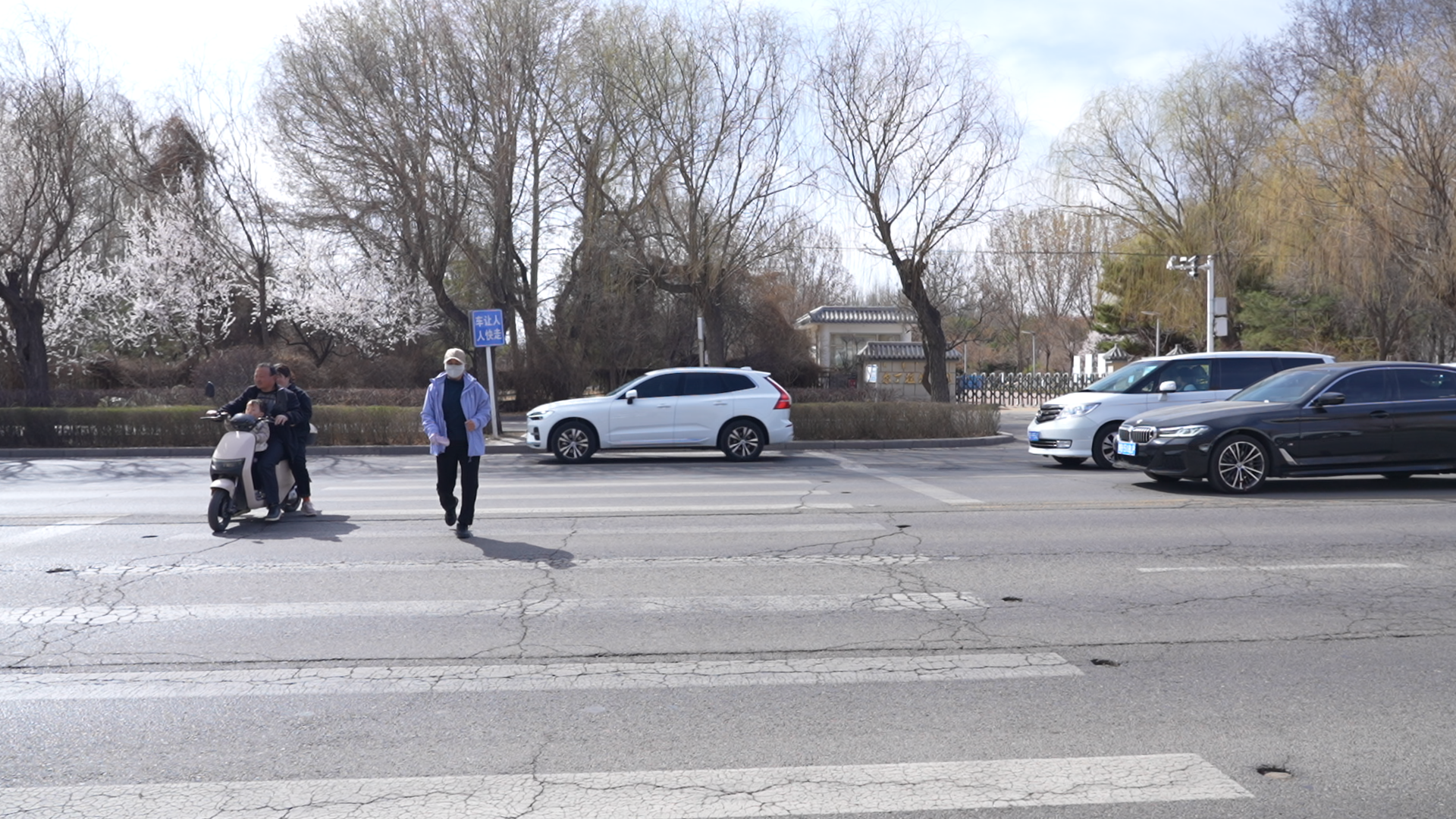 4月的阿尔丁北大街上桃花盛开,大街两侧阿尔丁植物园东西两园的柳树抽出嫩绿的新芽,一幅绝美街景呈现在记者眼前。 早晨8时30分,不少市民已经在植物园健身锻炼。站在阿尔丁大街上,不时看到有市民横穿40多米宽的大街,往返于两园之间。为保障行人安全通过,交管部门在阿尔丁大街两园出入口之间的斑马线附近设置了不礼让行人违法抓拍。 记者简单测算了一下,以1.5米/秒的速度,穿越阿尔丁大街往来东西两园,一个健康的成年人步行通过大概需要27秒。 早晨8时45分,记者看到一位老人从东园冲刺般快步走向西园,即便道路上的车辆已经停车避让,但老人还是一路踉踉跄跄,用了将近30秒过了马路。“这条路很宽,那么多车子都停下来给我让路了,心里就想着快点通过吧,不要让人等太久。”
